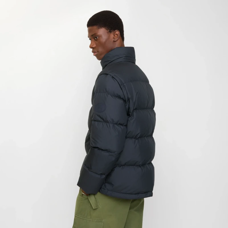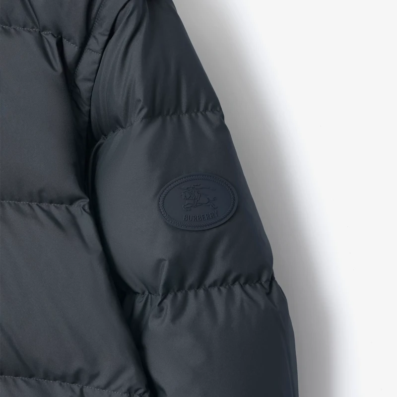Down jacket, filled with goose down and insulating fibers. Adorned with the brand's equestrian logo appliqué, inspired by archival patterns from the 1980s. Features detachable sleeves, allowing for versatile transitions between jacket and vest styles. Offers a relaxed fit with a detachable hood and collar lined with a wool lining accented with Burberry check.