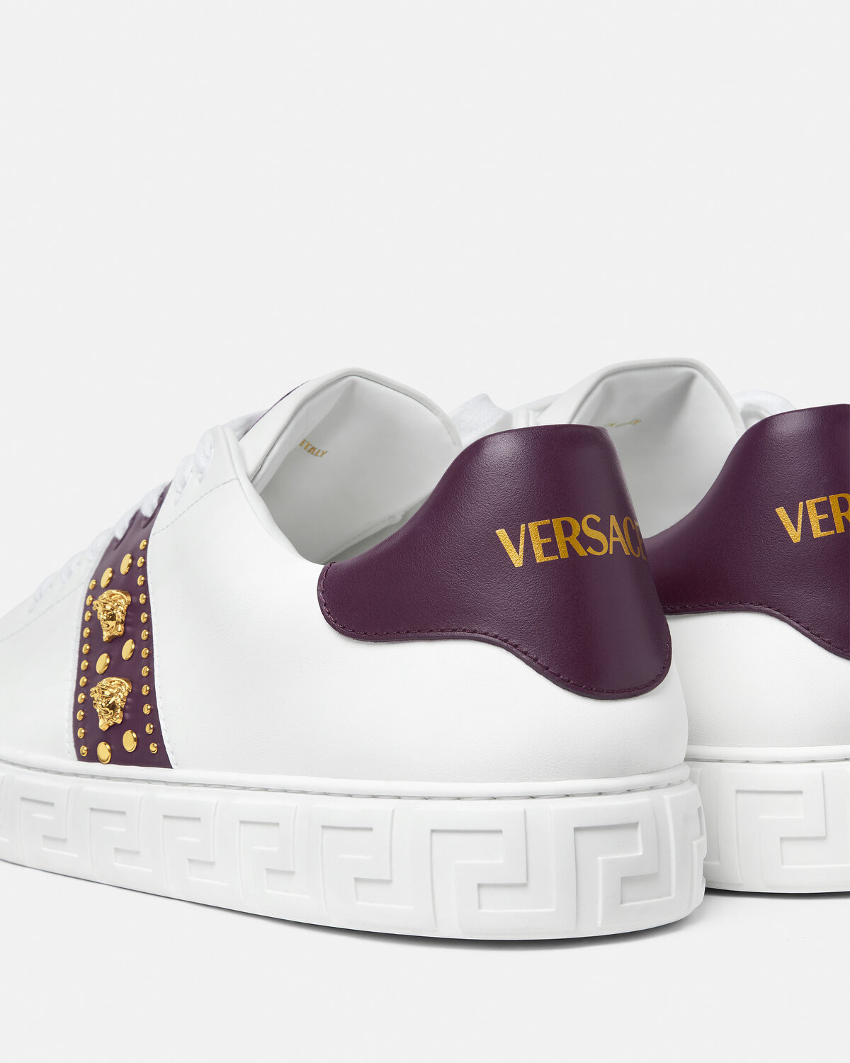 This low-cut sneaker features a Greca pattern carved on the sole, and the upper is decorated with rivets and embellished with Medusa accessories. The back side is decorated with Versace Logo stamp. Greca sports shoes are made of environmentally-friendly materials certified by recycled ingredients or/and derived from renewable raw materials.