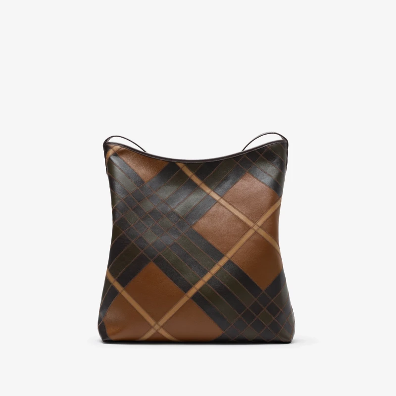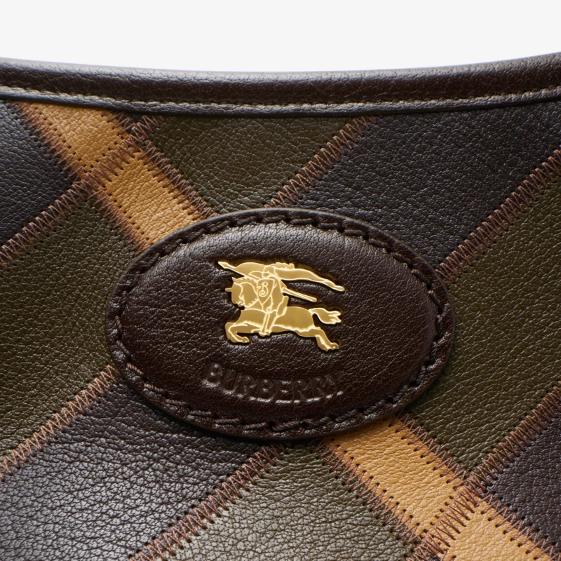 This shoulder bag draws inspiration from outdoor design. Crafted from grained buffalo leather, it is handcrafted in Italian workshops. It features a cotton lining. Leather panels are meticulously cut and hand-stitched, pieced together in Burberry check inlay. The size is suitable for a laptop and includes a slim shoulder strap. Adorned with a knight's stamp, a classic motif from the brand's 1980s bags, this piece debuted at the brand's 2025 Winter fashion show.