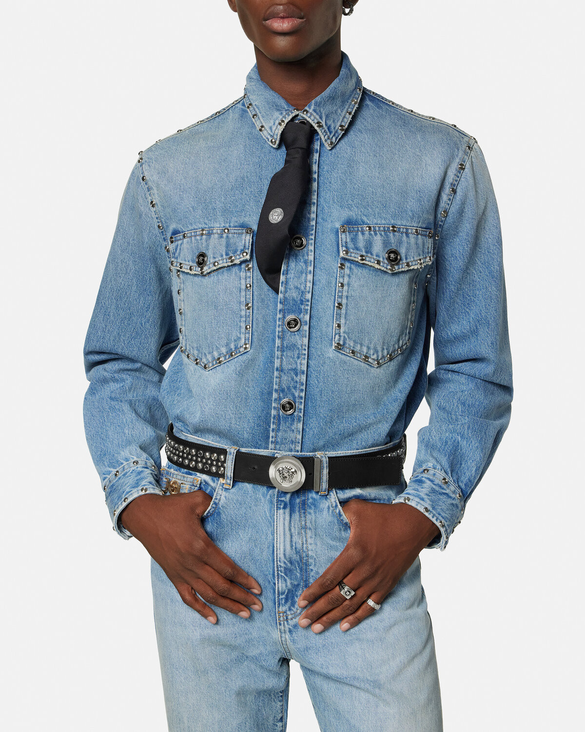 Cow leather belt with rivets and crystal decoration, Medusa Biggie buckle and decorative belt ring.