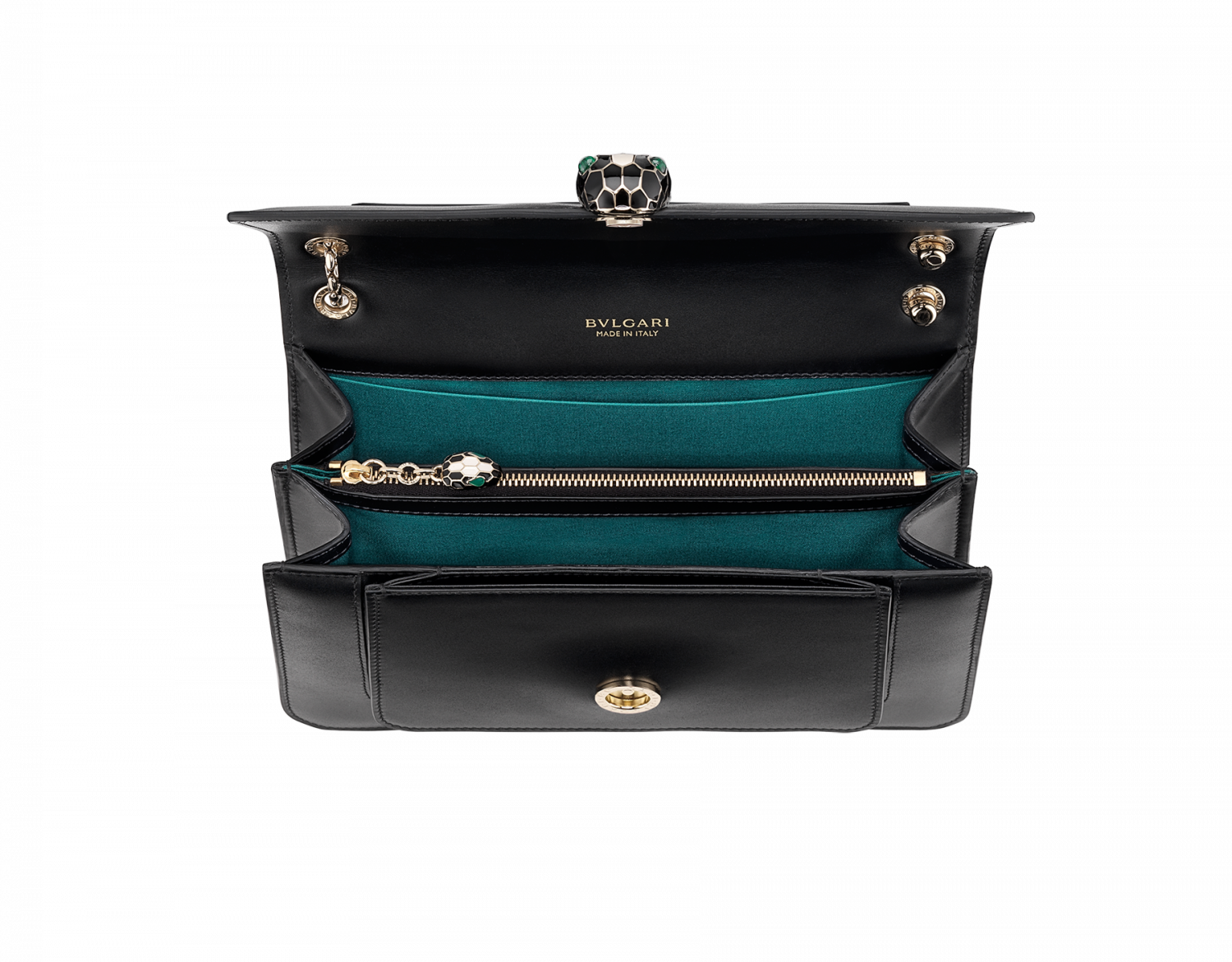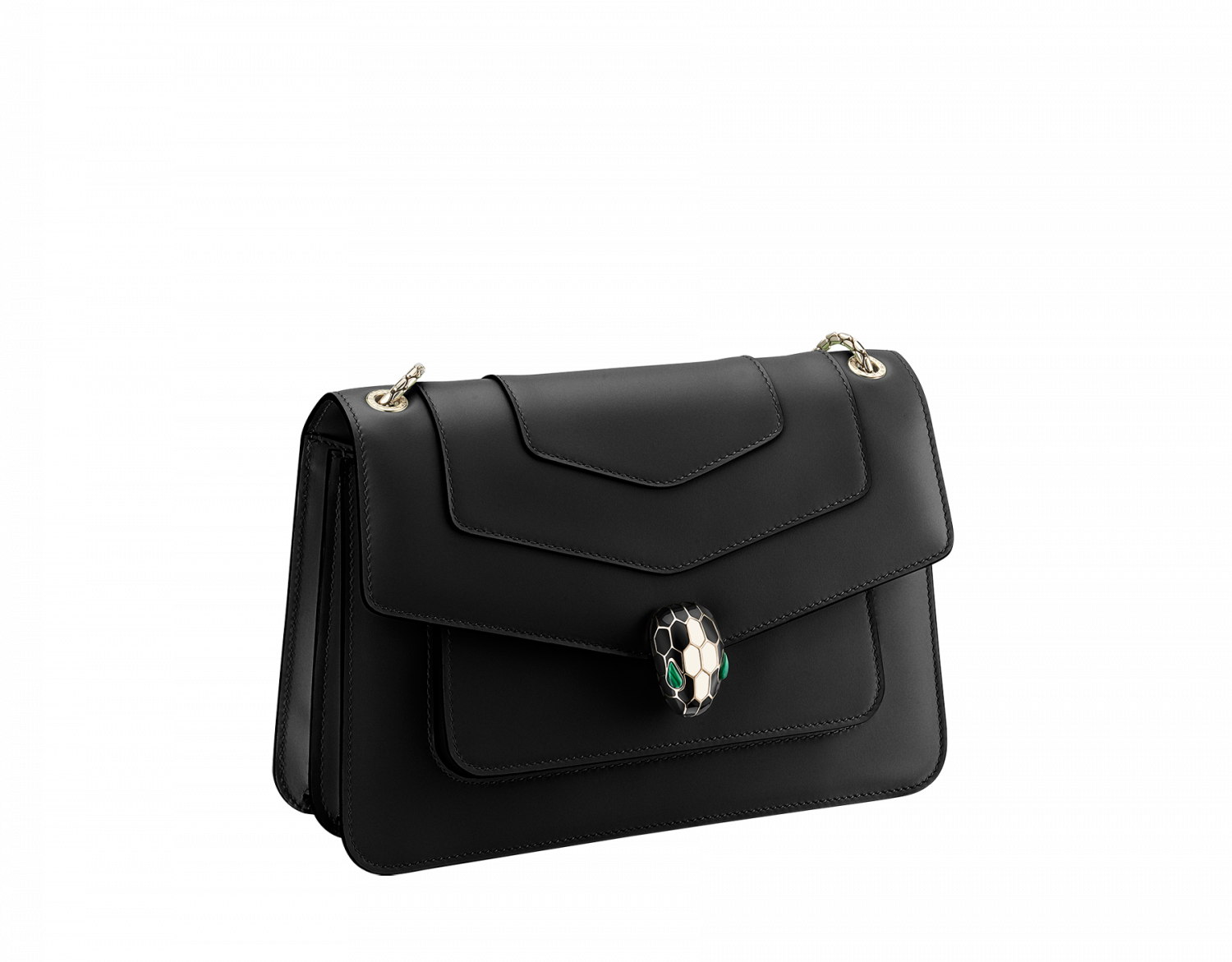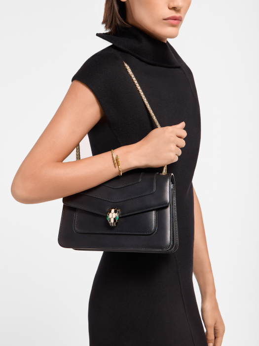 Serpenti Forever series medium shoulder bag, made of black calf leather, skillfully blends fashion and changeable charm. The work is matched with a snake-shaped chain shoulder strap and decorated with a classic snake head buckle. Its charming scales and design are inspired by Serpenti series jewelry in the 1960s, which is suitable for daily wear. There are two compartments, a front and back splicing pocket, a separate zipper pocket and an internal open pocket, one side of which can be customized, and the back is decorated with Bvlgari metal logo. 25 x 16.5 x 8 cm-9.8 x 6.7 x 3.1 inches. Made in Italy.