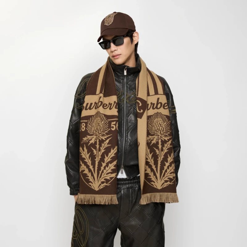Product Description: This scarf, crafted in Italian workshops from premium wool, features a new season's fine-woven pattern incorporating the brand's signature cursive logo. Inspired by sporty scarves, it cleverly blends exquisite elements such as the thistle shield, stripes, and the founding year of Burberry.
